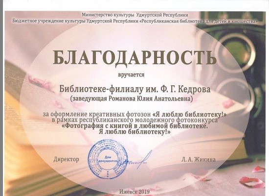 БУК УР «Республиканская библиотека для детей и юношества» благодарит Министерство культуры Удмуртской Республики, Парк культуры и отдыха им. С. М. Кирова (г. Ижевск) за поддержку и детские библиотеки республики за активное участие в проведении I-го республиканского хит-парада детских библиотек Удмуртской Республики «БиблиоБульвар “Отдыхай, но читать не забывай!”».